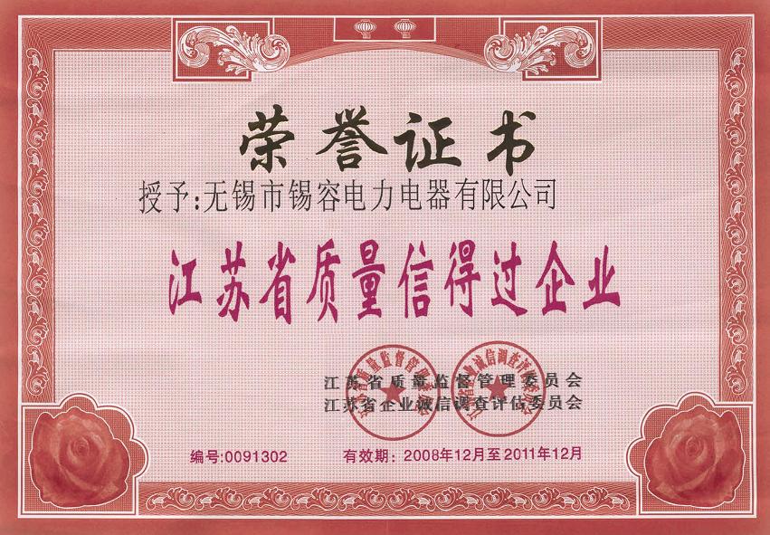 2008年江蘇省質(zhì)量監(jiān)督管理委員會、江蘇省企業(yè)誠信調(diào)查評估委員會,授予無錫市錫容電力電器有限公司 “江蘇省信得過企業(yè)”榮譽(yù)證書
